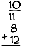 So far so good... let's try to divide by that number again. No good. So next you try the next prime number, which is 3... No good. So next you try the next prime number, which is 5... No good. So next you try the next prime number, which is 7... No good. So next you try the next prime number, which is 11... No good. So next you try the next prime number, which is 13... No good. So next you try the next prime number, which is 17... No good. So next you try the next prime number, which is 19... No good. So next you try the next prime number, which is 23... No good. So next you try the next prime number, which is 29... No good. So next you try the next prime number, which is 31... No good. So next you try the next prime number, which is 37... No good. 37 is larger than 33. So we're done reducing. And we're done! Here's the final answer to 10/11 + 8/12