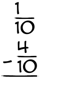 Step 1Since our denominators match, we can subtract the numerators. 1 − 4 = -3 So the answer is: