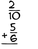 Step 1Can you add yet? Nope! The denominators don't match. We need a common denominator. So next we take both denominators and multiply them. Next, take each numerator and multiply it by the denominator of the other term. So, we multiply 2 by 6, and get 12, then we multiply 10 by 6 and get 60. Now for the second term. You multiply 5 by 10, and get 50, then multiply 10 by 6 and get 60. We now have a new problem, that looks like this: