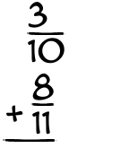 Step 1We can't add two fractions with different denominators (the bottom number). So you need to get a common denominator - both bottom numbers need to match. To do this, you'll multiply the denominators times each other... but the numerators have to change, too. They get multiplied by the other term's denominator. So we multiply 3 by 11, and get 33, then we multiply 10 by 11 and get 110. Do the same for the second term. We multiply 8 by 10, and get 80, then multiply 10 by 11 and get 110. So now our fractions look like this: