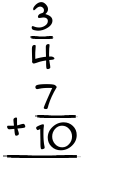 Step 1We can't add two fractions with different denominators (the bottom number). So you need to get a common denominator - both bottom numbers need to match. To do this, you'll multiply the denominators times each other... but the numerators have to change, too. They get multiplied by the other term's denominator. So we multiply 3 by 10, and get 30, then we multiply 4 by 10 and get 40. Do the same for the second term. We multiply 7 by 4, and get 28, then multiply 4 by 10 and get 40. So now our fractions look like this: