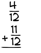 Step 1Since our denominators match, we can add the numerators. 4 + 11 = 15 That gives us the sum, which is
