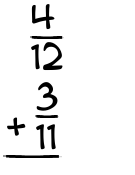 Step 1Of course, you can't add two fractions if the denominators (bottom numbers) don't match. To get a common denominator, multiply the denominators together. Then we fix the numerators by multiplying each one by their other term's denominator. Now you multiply 4 by 11, and get 44, then we multiply 12 by 11 and get 132. Do the same for the second term. We multiply 3 by 12, and get 36, then multiply 12 by 11 and get 132. The problem now has new fractions to add: