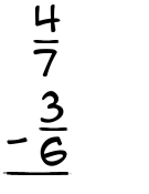 Step 1We can't subtract two fractions with different denominators. So you need to get a common denominator. To do this, you'll multiply the denominators times each other... but the numerators have to change, too. They get multiplied by the other term's denominator. So we multiply 4 by 6, and get 24. Then we multiply 3 by 7, and get 21. Next we give both terms new denominators -- 7 × 6 = 42. So now our fractions look like this: