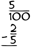 Step 1We can't subtract two fractions with different denominators. So you need to get a common denominator. To do this, you'll multiply the denominators times each other... but the numerators have to change, too. They get multiplied by the other term's denominator. So we multiply 5 by 5, and get 25. Then we multiply 2 by 100, and get 200. Next we give both terms new denominators -- 100 × 5 = 500. So now our fractions look like this: