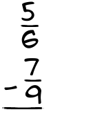 Step 1We can't subtract two fractions with different denominators. So you need to get a common denominator. To do this, you'll multiply the denominators times each other... but the numerators have to change, too. They get multiplied by the other term's denominator. So we multiply 5 by 9, and get 45. Then we multiply 7 by 6, and get 42. Next we give both terms new denominators -- 6 × 9 = 54. So now our fractions look like this: