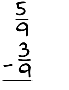Step 1Since our denominators match, we can subtract the numerators. 5 − 3 = 2 So the answer is: