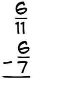 Step 1We can't subtract two fractions with different denominators. So you need to get a common denominator. To do this, you'll multiply the denominators times each other... but the numerators have to change, too. They get multiplied by the other term's denominator. So we multiply 6 by 7, and get 42. Then we multiply 6 by 11, and get 66. Next we give both terms new denominators -- 11 × 7 = 77. So now our fractions look like this: