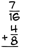 Step 1We have to make sure the denominators are equal. 16 goes into 8 evenly, so we only need to multiply one term to get a common denominator. Multiply 4 by 2, and get 8, then we multiply 8 by 2 and get 16. We now have a new problem, that looks like this: