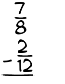 Step 1We can't subtract two fractions with different denominators. So you need to get a common denominator. To do this, you'll multiply the denominators times each other... but the numerators have to change, too. They get multiplied by the other term's denominator. So we multiply 7 by 12, and get 84. Then we multiply 2 by 8, and get 16. Next we give both terms new denominators -- 8 × 12 = 96. So now our fractions look like this:
